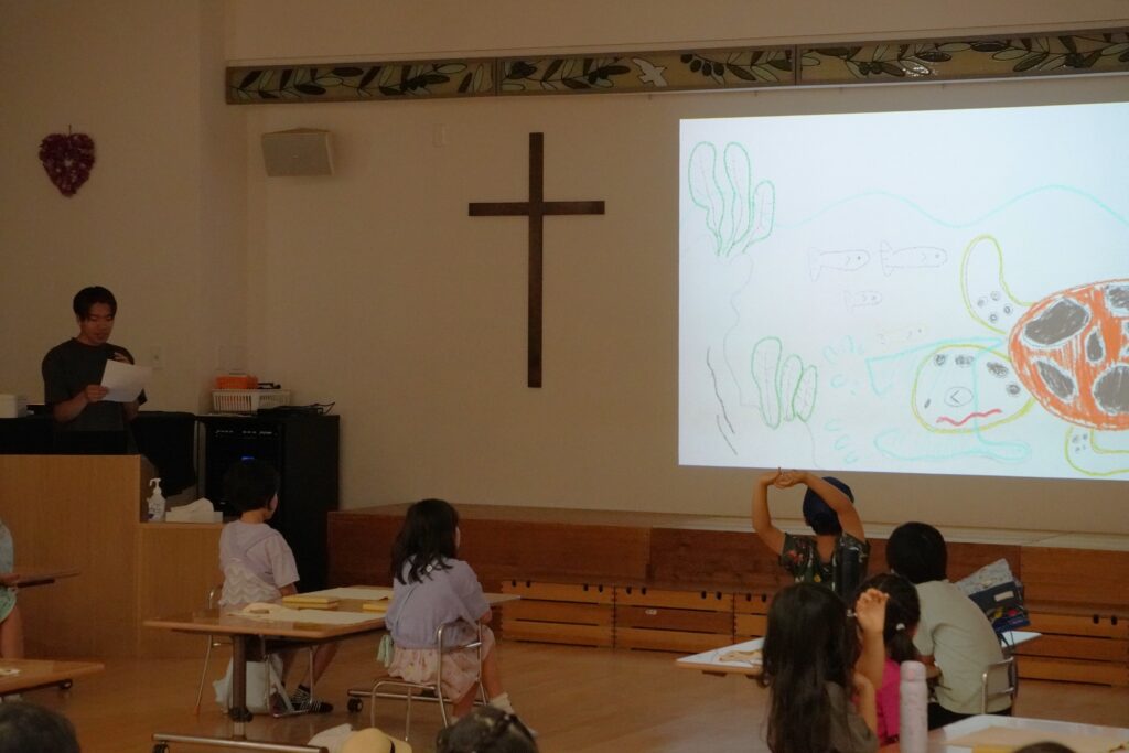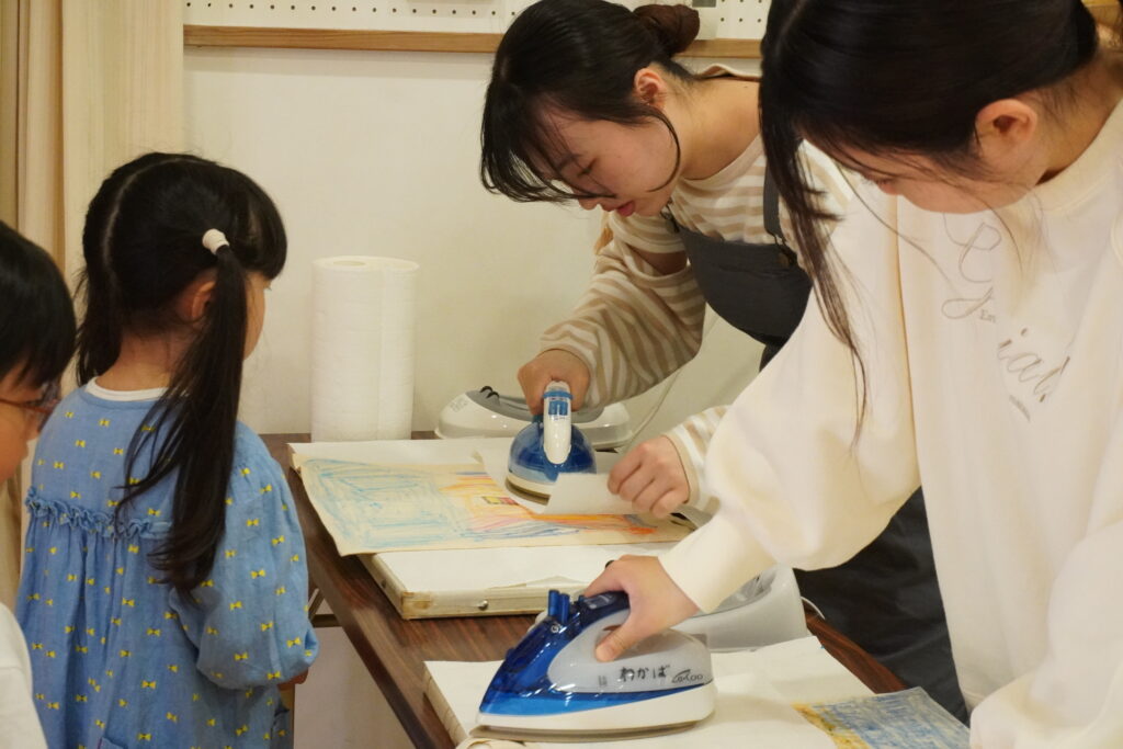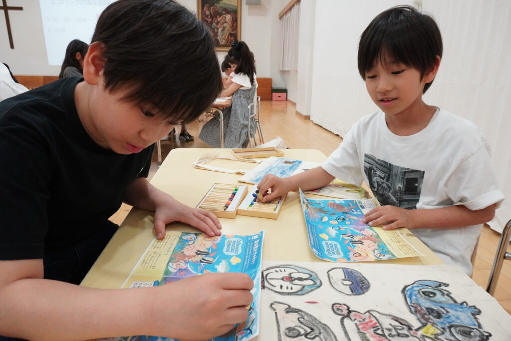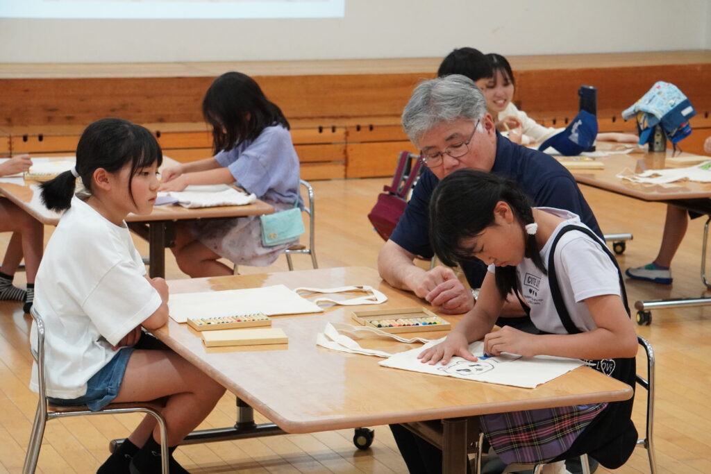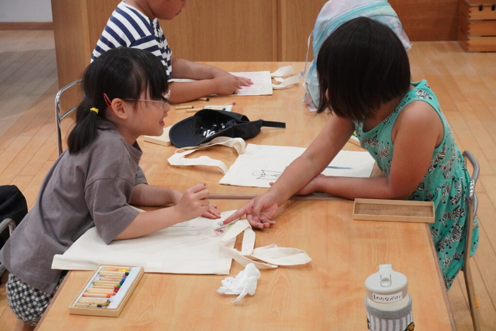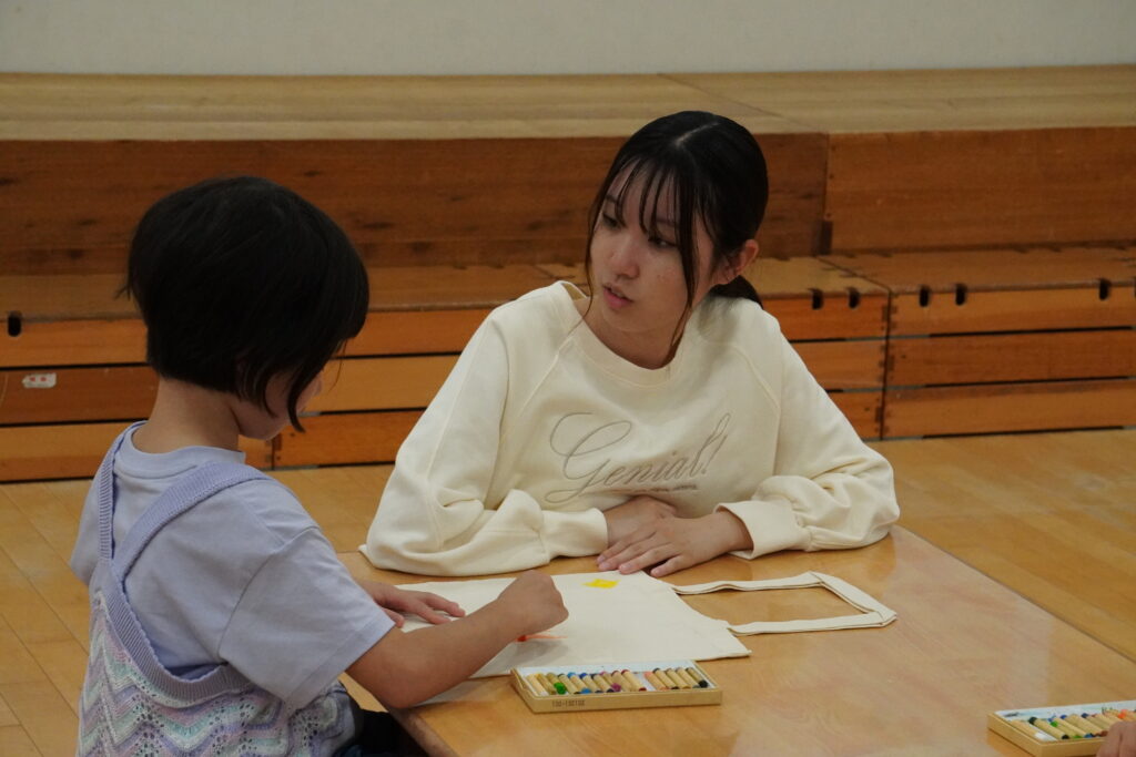 今年は、「エコバッグに子どもたちが絵を描くワークショップ」のプログラム運営を4名の学生が担当。「うみにいきる○○たち」というオリジナルの紙芝居を披露し、プラスチック製品で環境が汚染されていることについて問題意識を持ち、エコバッグの必要性とワークショップの趣旨を伝えました。参加した子どもたちからは「家で何を描くか決めてきた!」といった声があり、この日を楽しみにしていた様子。布に描けるクレヨンを用いて、表面だけでなく裏面にもデザインを施すなど、思い思いにエコバッグ作りを楽しみました。