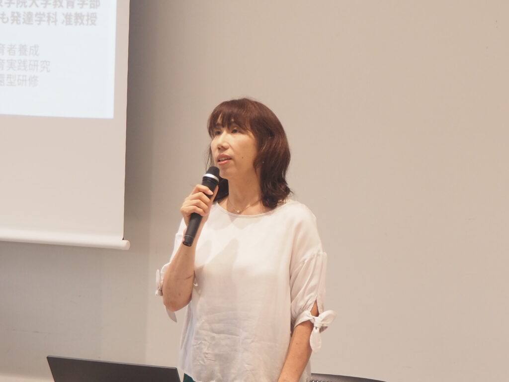 この石井教諭の話を受け、三谷准教授からは、園と地域の関わりを考える上での視点について、「子どもの遊びや園の保育に地域を活用するということと、子どもや園の存在が地域の人々を繋ぎ、地域を活性化していく拠点となること。この2つの視点が石井先生の話を聞いて重要だと感じました。子どもは遊びの中で地域への親しみを持ち、地域の人々はその子どもたちや園と関わることで、新しい取り組みが生まれ、地域がにぎわっていくのではないかと思います」と保育学の観点から解説しました。