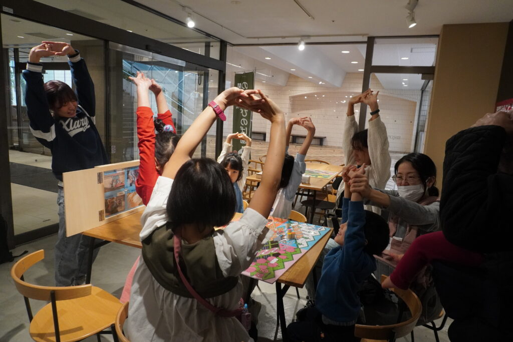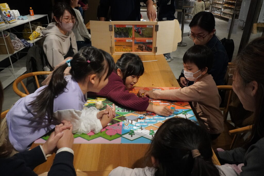 また、食育も兼ねてすごろく形式でお米のなりたちを学ぶ「お米ちゃんの大冒険」を調理前に実施。お米が四季を通してどのように成長し私たちのもとへ届けられているのかについて学びました。すごろくでは教育学部の学生もサポートに入り、お米ちゃんの成長をみんなで見届けました。