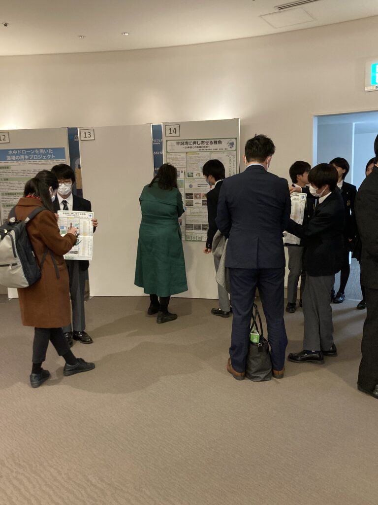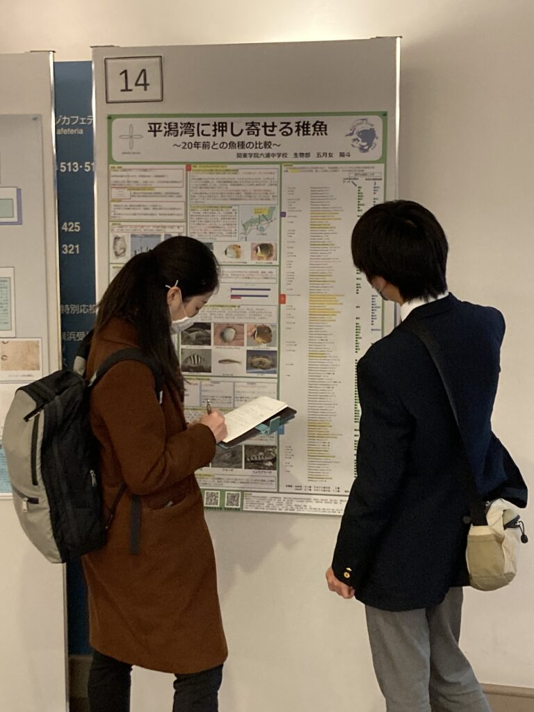 生物部は、「マリンチャレンジプログラム2023」において関東ブロックで採択された「平潟湾に押し寄せる稚魚~20年前との魚種の比較~」という研究テーマをポスター発表しました。ISAP2023には新たに英語版ポスターを作成し、海外からの来場者に説明しました。