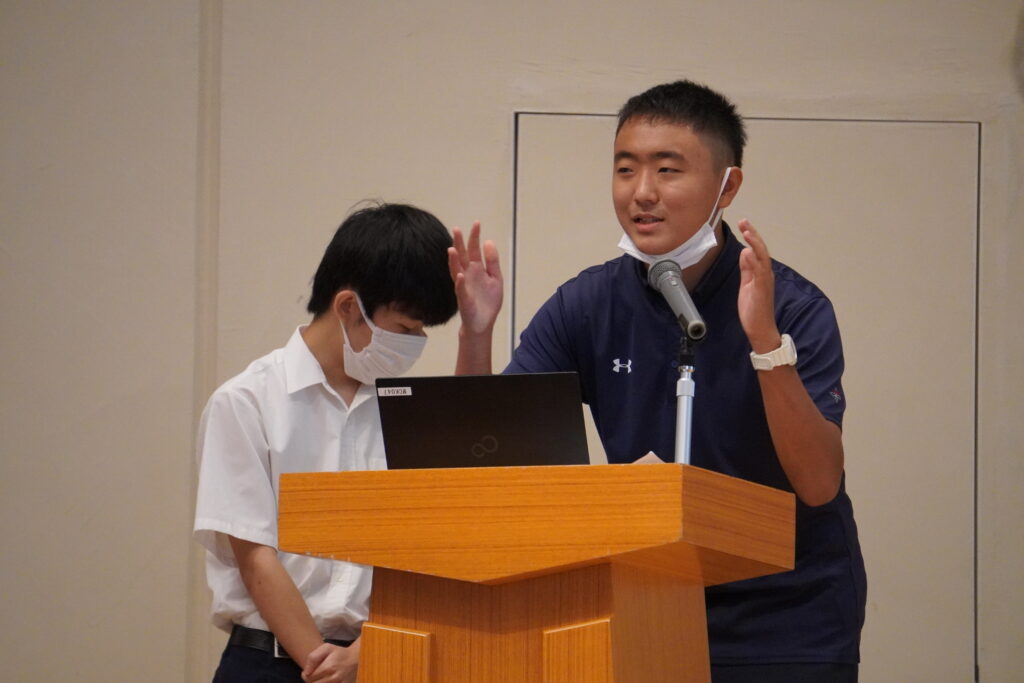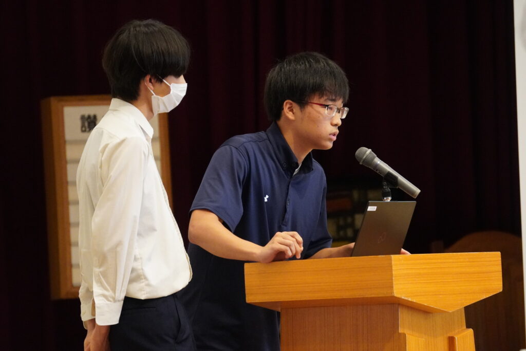 9/11には、半年間かけて取り組んできた「探求実験」の集大成として同校メービー礼拝堂で実験成果報告会が行われ、生物を履修する生徒たちが研究成果をプレゼンテーションしました。発表テーマは「マリーゴールドの発芽速度 発芽本数に音楽が与える影響」「アメリカザリガニの感覚器官と捕食の関係」「ダンゴムシの記憶と疲労と交換性転向反応」「ミドリムシの光走性と光の波長の関係」など、日常の生活でふと疑問に思ったことや学校生活での気づきをきっかけとした13テーマ。中には、昨年度の先輩たちの実験を引き継いで、発展的なテーマを設定したグループも見受けられました。