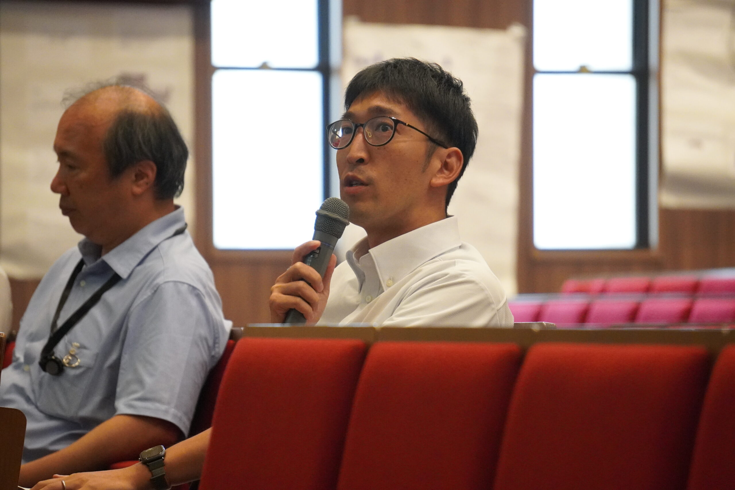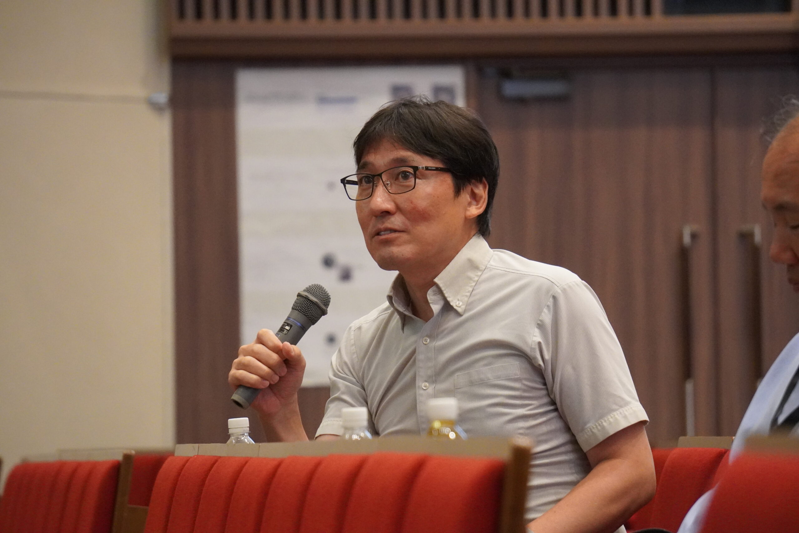 生徒たちは仮説や実験方法、考察や今後の課題と展望を、スライドを用いて7分間で発表。発表後には、2つの実験を比較した際の条件は揃っているのか、個体差は関係していないかなど、活発な質疑応答が繰り広げられました。時折、審査員として出席していた、海老原教授、近藤陽一教授(植物分子生物学)、新家専任講師より、実験方法や考察に対するアドバイスや、実際の研究者が用いる手法で実験が進められていると講評されると、登壇していた生徒は笑みを浮かべました。