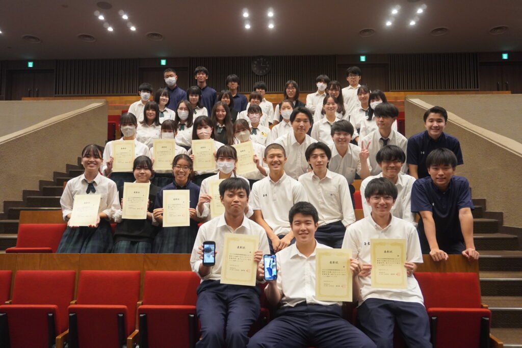 また、それぞれのプレゼンテーションは「発表内容」「プレゼン」「質疑応答」の3項目で審査員と生徒たちによって審査され、最優秀賞、優秀賞、ベストプレゼン賞が選出されました。表彰式では賞を獲得したグループが呼ばれると、生徒たちからは驚きや喜びの声が上がり、安堵の表情で海老原教授から表彰状を受け取りました。