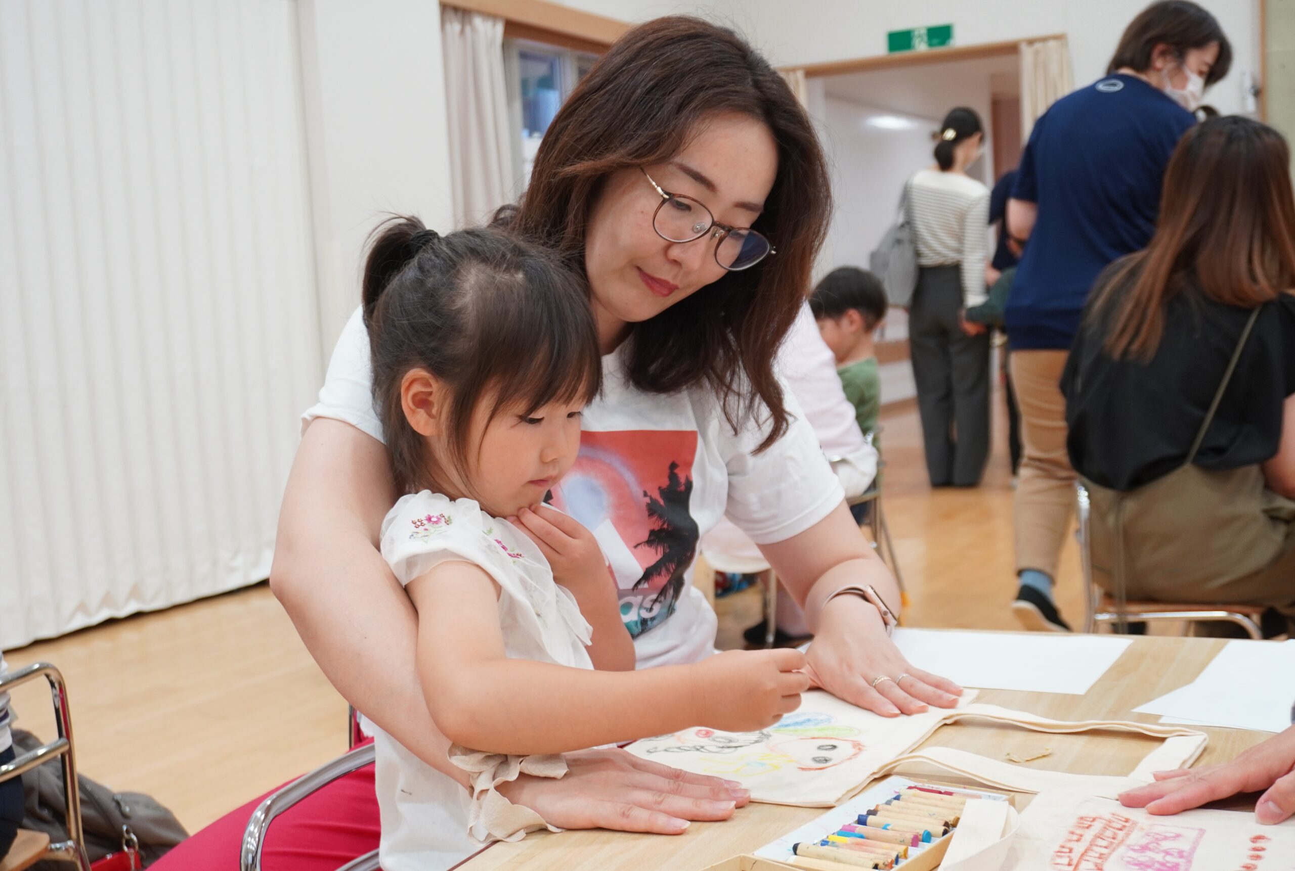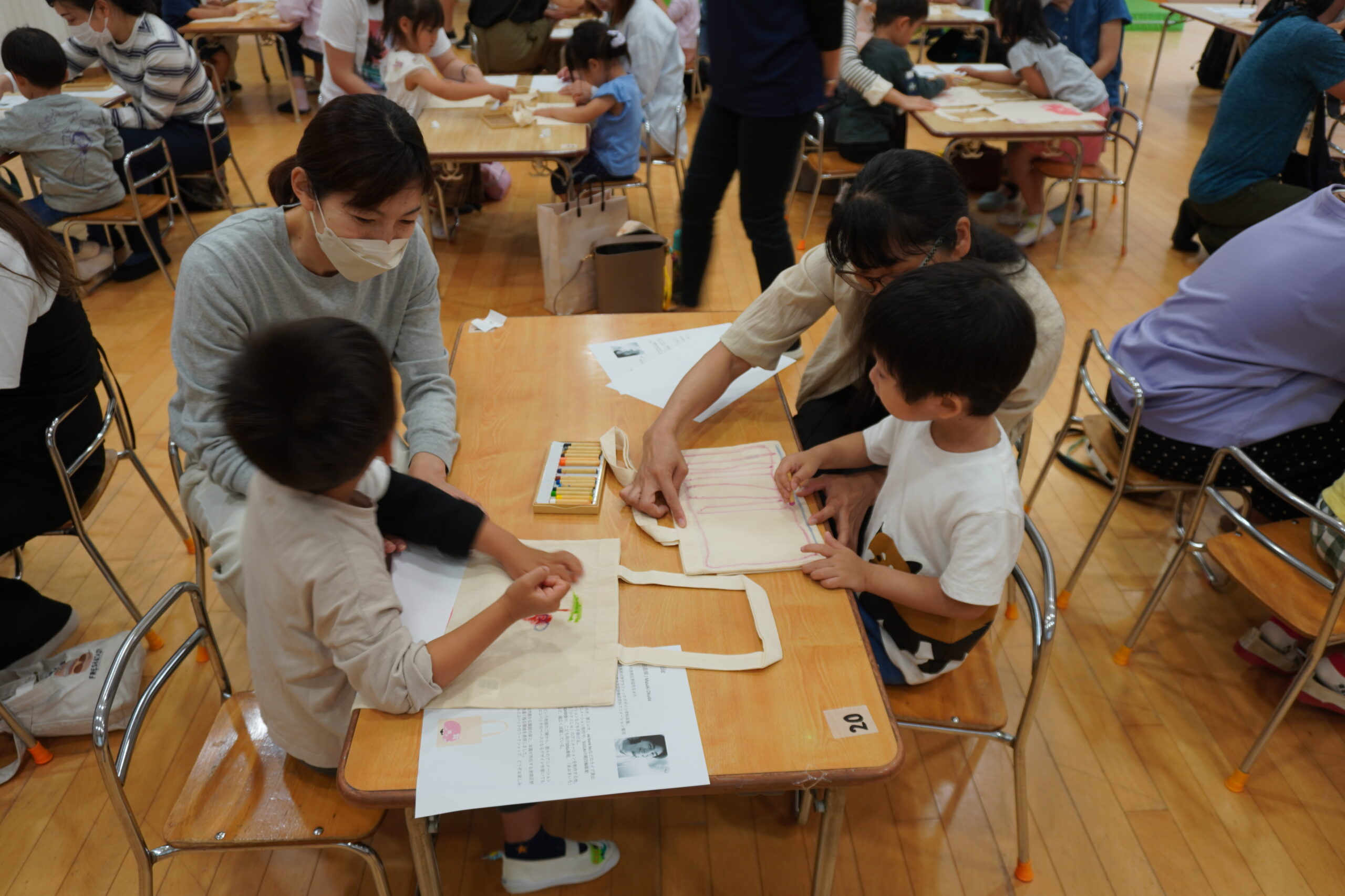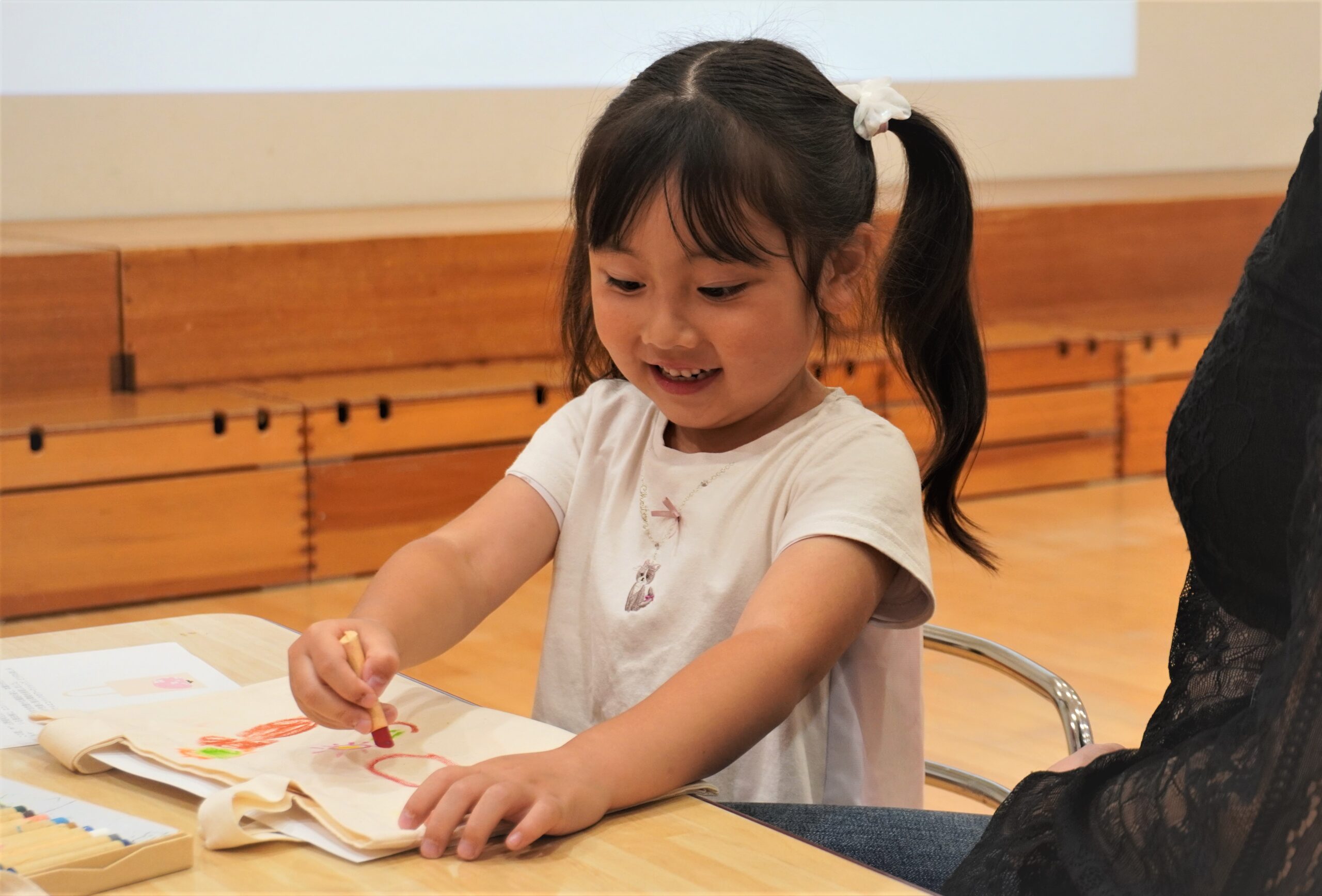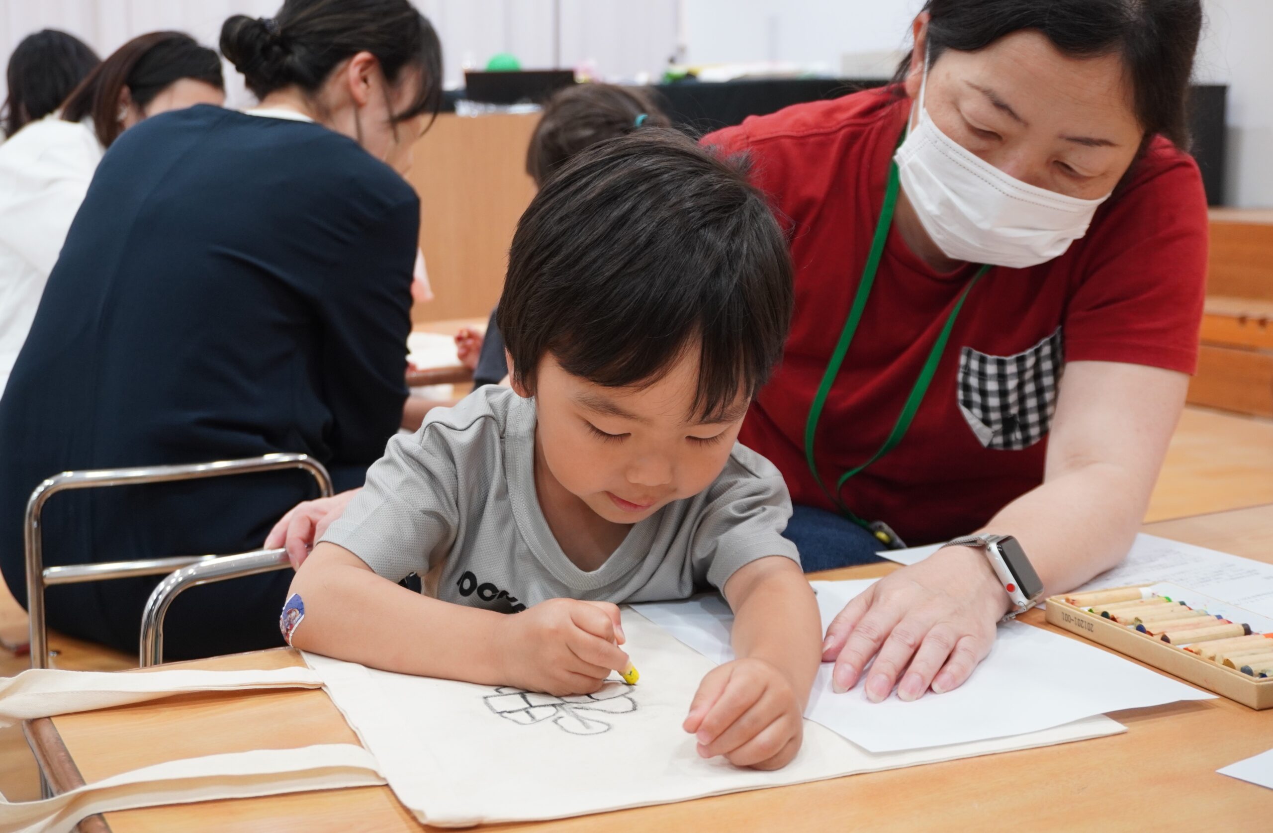 ワークショップの導入では、教諭達と無印良品スタッフによる劇「うみであそぶ」が披露され、海の生きものや地球環境を守るためにビニール袋を使う機会を減らす必要があることを伝えました。その後、「園庭で見かける好きな虫、花、植物」もしくは「好きな場所、好きな遊び」をテーマに、こども達がクレヨンを使って保護者と一緒に自由に絵を描き、「世界にひとつだけのエコバッグ」を作りました