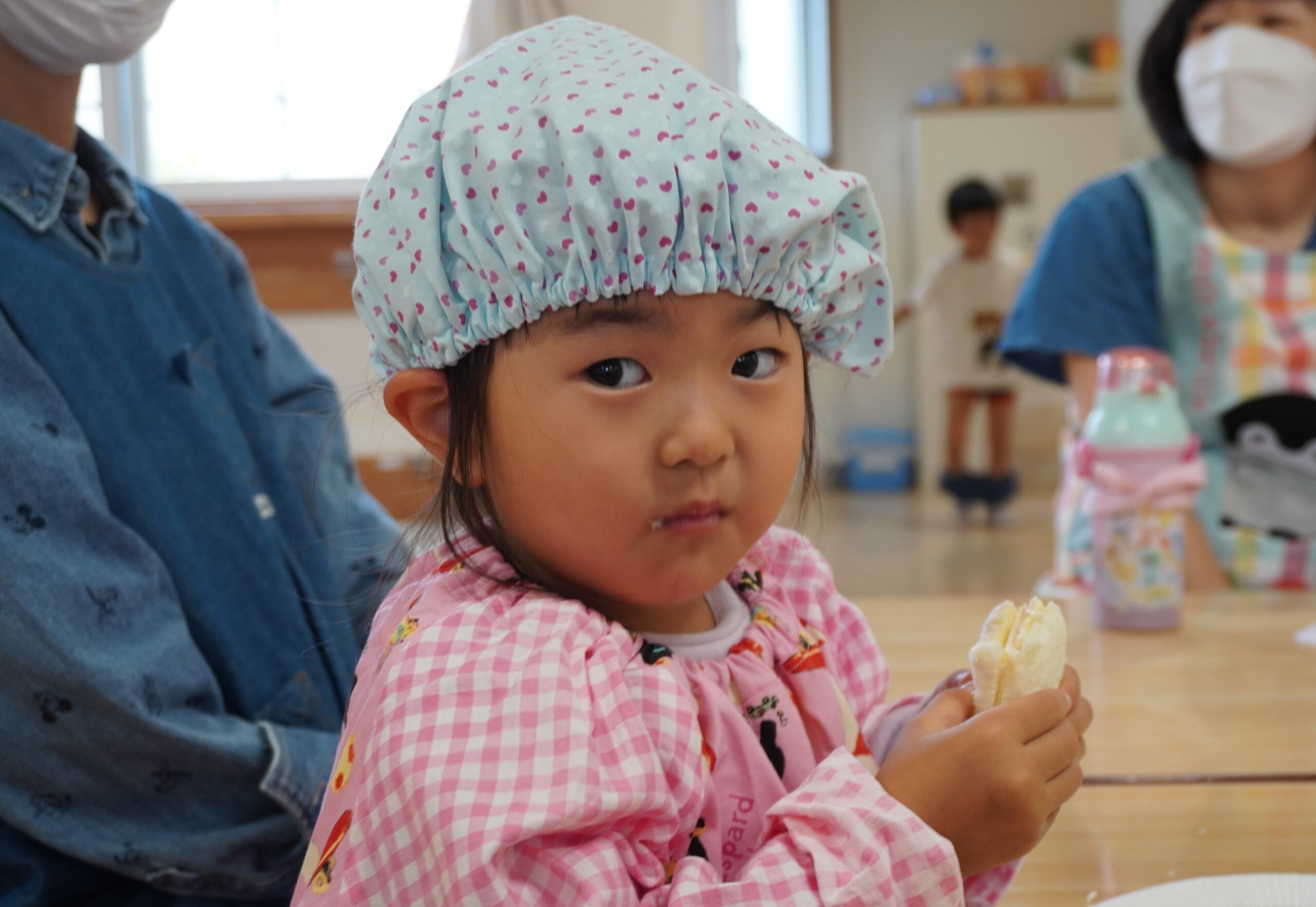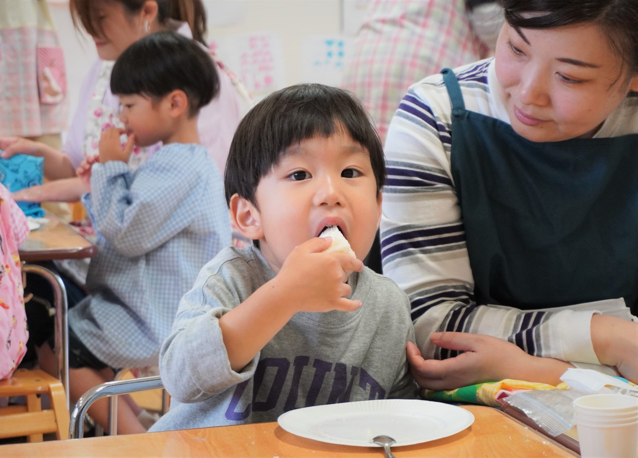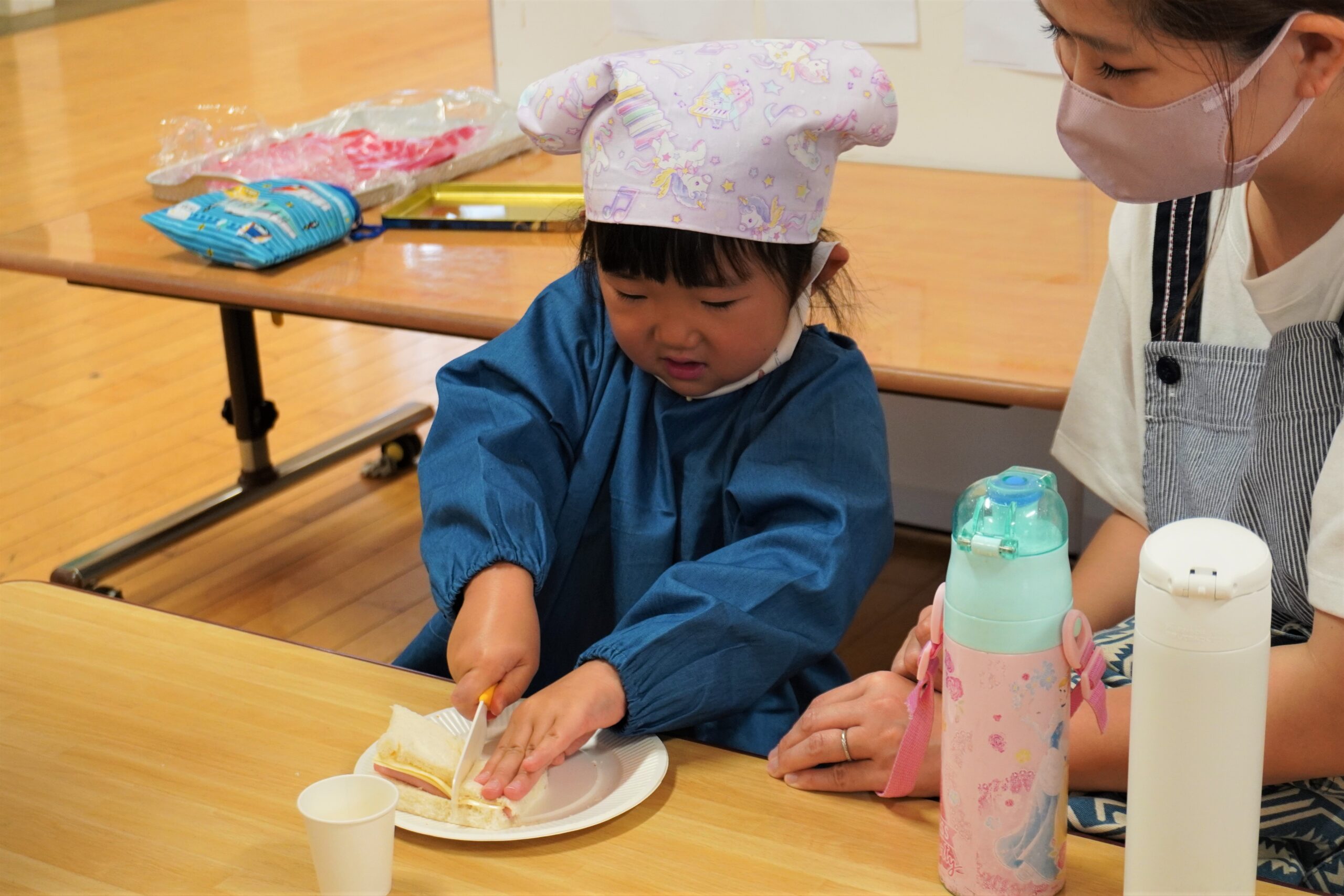 さらに、今年度はサンドウィッチとラスク作りを同時開催。1枚の食パンを無駄なく使うことで食品ロスを減らすことを目的とし、食べ物の大切さを学びました。簡単にできるため、参加した子どもたちからは「これならお家でもできるね」、「また食べたい!」などの声があがり、楽しみながらクッキングを行っている様子でした。
